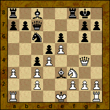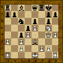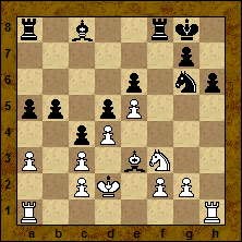 Возможности вторжения белых ладей по вертикали "h" и прыжка белого коня на g5 обеспечивают белым достаточную компенсацию за фигуру. После хода ўе3 могут двинуться вперед белые пешки "f" и "g". Во всяком случае, перед черными стоят непростые в игре за доской задачи. 23... Rf7 24. Ke3 b4 25. Ng5 Rf5 26. Rh7 Kg8 27. R7h5 Укрепляя позицию коня g5, белые готовят надвижение пешек королевского фланга. 27... Ra7