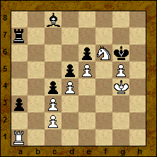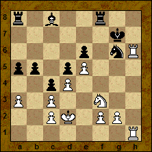 Материальное равновесие восстановленно, и теперь решающим фактором в оценке позиции становится превосходство белого коня над плохим "французским" слоном. 33. Nh7! Конь направляется на f6, что позволит сочетать продвижение пешки "g" c созданием матовых угроз черному королю. Проходная пешка черных по вертикали "a" в данном случае не может компенсировать глобальных недостатков их позиции. 33... Rg7 34. Nf6 Kf7 35. Kf4 Kg6 36. Ra1 Ra7 37. R:a3 a4 38. g5 Bd7 39. Ra1 a3 40. Kg4 Белые играют на матовую атаку.