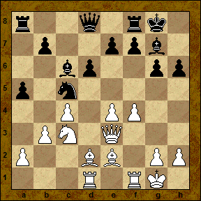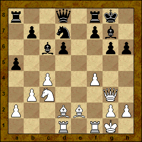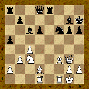 Возникшие, в рзультате прорыва е4-е5, недостатки пешечной структуры черных компенсируются активным расположением их слонов. Сейчас заслуживало внимания 19...a4!?, беспокоя ферзевый фланг соперника и вводя в бой ладью а8. 19... Re8?! Несколько шаблонное продолжение, позволяющее белым консолидировать ситуацию в центре. 20. Bf3 Nf6 21. f5! Подчеркивая недостатки хода h7-h6. 21... Kh7