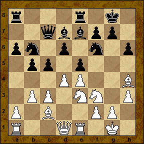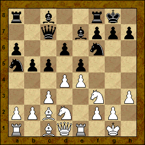 [Во встрече С.Полгар - В.Унцикер (Мюнстер 1993) черные немедленно прибегли к тематическому продвижению 15... c4 , и после 16. b4 a5 17. a3 ab 18. ab Ra1 19. Qa1 Ra8 20. Qc1 Ra2 21. Bb1 Ra1 22. Qb2 Ra8 23. Ng3 h6 24. Be3 Ra6 достигли полноправной игры.]