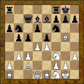 1. e4 e5 2. Nf3 Nc6 3. Bb5 a6 4. Ba4 Nf6 5. O-O Be7 6. Re1 b5 7. Bb3 d6 Отказываясь "пугать" соперника контр-атакой Маршалла (7...0-0 8.c3 d5), черные демонстрируют свое явное стремление к стратегическим построениям в испанской партии. 8. c3 O-O 9. h3 Na5 10. Bc2 c5 11. d4 Qc7 12. Nbd2