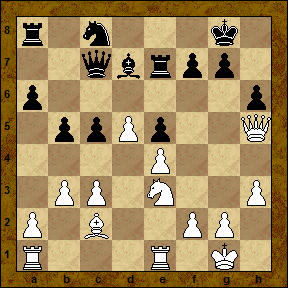 17... Nh5? Идея разменять чернопольных слонов выглядит вполне логичной, но встречает тактическое опровержение. 18. Be7 Re7 19. Ne5! de 20. d5! Этот промежуточный ход выпал из поля зрения черных! Надо признать, что "маленькая" комбинация белых не лишена оригинальности и поэтому воплотилась в жизнь. 20... Nc8 21. Qh5